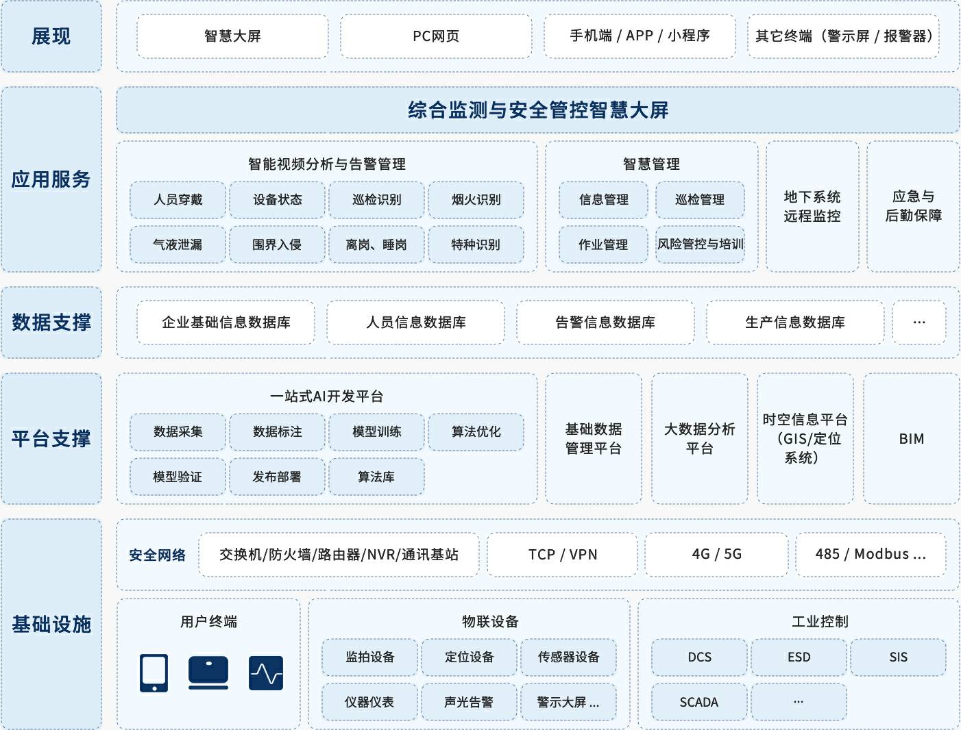 针对矿山安全生产的管理要求,紧抓需求痛点,乐鱼网页版登录入口-乐鱼(中国) 创新提出“一基础、双支撑、多平台、N应用”的智慧矿山方案,实现不同阶段需求逐步实现未来智慧矿山。乐鱼网页版登录入口-乐鱼(中国) 创新充分利用人工智能算法优势,从智能视频分析风险隐患切入,实现风险隐患全生命周期分析与管理,同时应用智慧化作业流程、智慧检维修提升作业生产效率,应急与后勤保障是重中之重,除了实现地下通风系统、定位系统、电力系统、通讯系统、排水系统以及环境监测系统的全天候监控之外,应急物资管理系统保障物资及时可用,人员设备定位系统保障下井人员位置的实时管控,充分实现应急后勤保障,乐鱼网页版登录入口-乐鱼(中国) 创新智慧矿山方案永远将安全生产放在第一位。